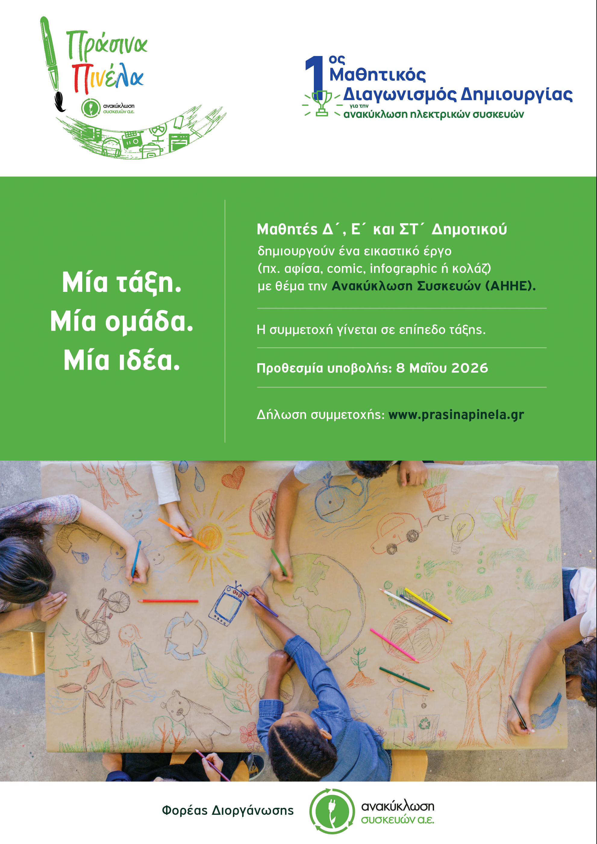1ος Μαθητικός Διαγωνισμός “Πράσινα Πινέλα” 2025-2026 για την Ανακύκλωση Συσκευών Α.Ε. Η Ανακύκλωση Συσκευών Α.Ε. διοργανώνει τον 1ο Μαθητικό Διαγωνισμό Εικαστικής Δημιουργίας, με τίτλο «Πράσινα Πινέλα», για τη σχολική χρονιά 2025–2026. Ο διαγωνισμός αφορά μαθητές και μαθήτριες Δ’, Ε’ και ΣΤ’ Δημοτικού. Υλοποιείται σε επίπεδο σχολικής τάξης, με στόχο την ενίσχυση της περιβαλλοντικής ευαισθητοποίησης, της συλλογικής έκφρασης και της ενημέρωσης για τη σωστή ανακύκλωση ηλεκτρικών και ηλεκτρονικών συσκευών, καλλιεργώντας από μικρή ηλικία στάσεις υπευθυνότητας και σεβασμού προς το περιβάλλον. Μέσα από την τέχνη, τα παιδιά μετατρέπονται σε ενεργούς φορείς αλλαγής, ανακαλύπτοντας τη δύναμη της ανακύκλωσης και τη σημασία της βιώσιμης καθημερινότητας. Οι αιτήσεις...
