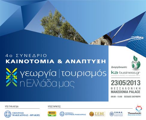 Το 4ο Συνέδριο “Καινοτομία και Ανάπτυξη: Γεωργία – Τουρισμός, η Ελλάδα μας” διοργανώνει το διαδικτυακό κανάλι “KA Business” με την υποστήριξη της Περιφέρειας Κεντρικής Μακεδονίας, την Πέμπτη 23 Μαΐου 2013 (ώρες 09.00-15.00) στο ξενοδοχείο MAKEDONIA PALACE στη Θεσσαλονίκη.